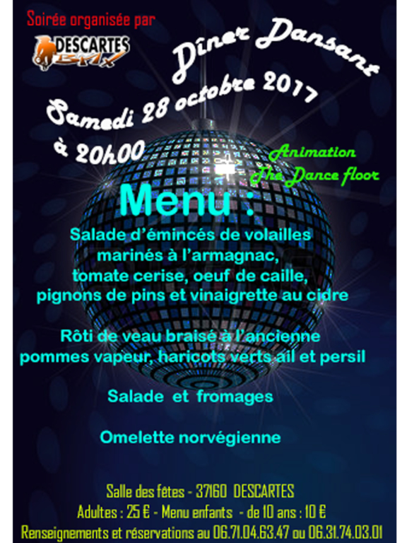 Le club est heureux de vous inviter à son dîner Dansant. Venez passer une agréable soirée à la salle des fête de Descartes.